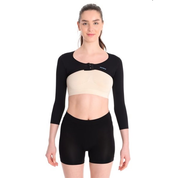 این با پارچه ی تخصصی آئورالیپو ساخته شده و برای استفاده پس از عمل های لیپوساکشن یا برداشتن چربی در نواحی شانه و بازو طراحی شده است. این گن با سیستم سه قلاب فشرده سازی موثر تر و راحتی بالاتر را فراهم میسازد.